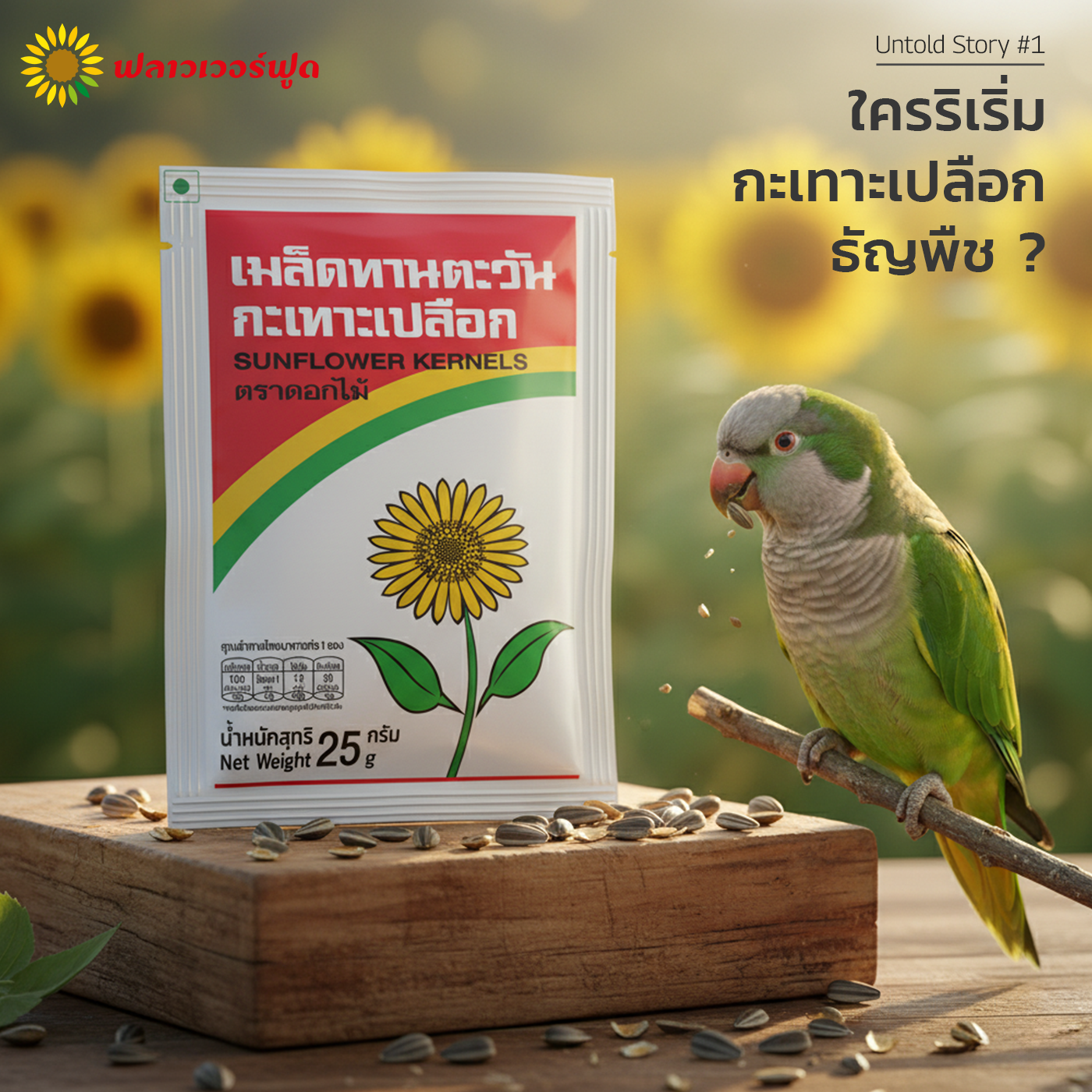 เมล็ดทานตะวัน อบกะเทาะเปลือก ซองสีขาวมีแถบสามสี (เขียว เหลือง แดง) เรียกได้ว่าใครเห็นรูปก็คงจะร้อง อ๋อ ขึ้นมาทันที แต่จะมีซักกี่คนที่รู้ว่ามันยี่ห้ออะไร?